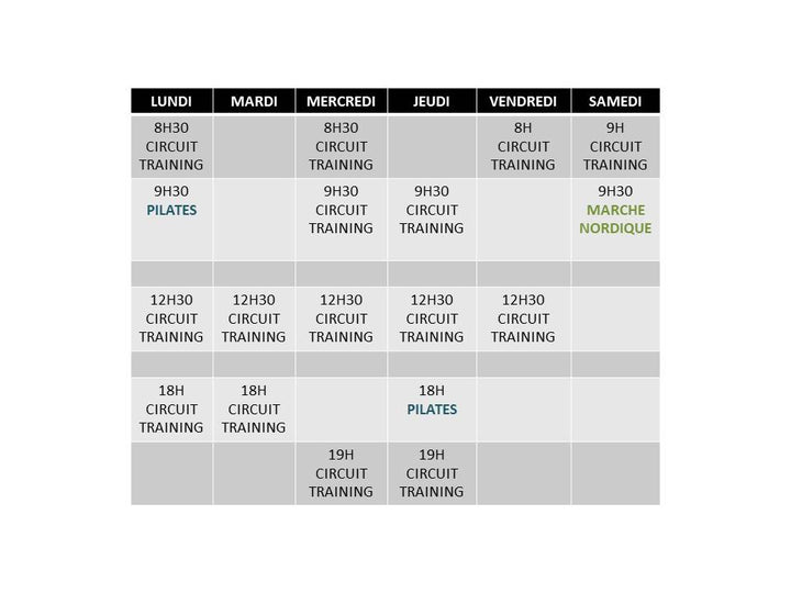 Retrouvez les différentes plages horaires des cours de Pilates, Circuit training, Marche Nordique.